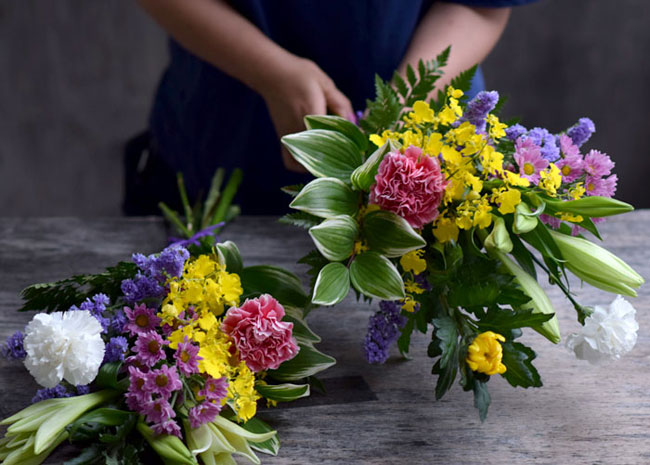 ふんわりやさしい想いを届ける対束です 季節の花、向日葵入りの対束 優しく華やかにまとめます ※ラッピング不要の場合はセロファンで包んでお届けいたします 「持ち運び用-有料袋-をお求めの方はコチラ→」