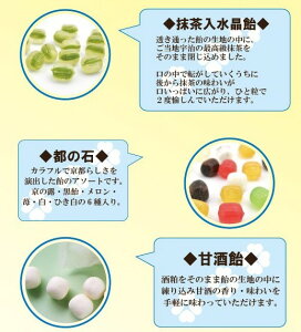 飴は「抹茶入り水晶飴」「甘酒飴」「生姜飴」「都の石」「梅干・しそミックス」「サイダー・レモンミックス」の6種類からお選び下さい。